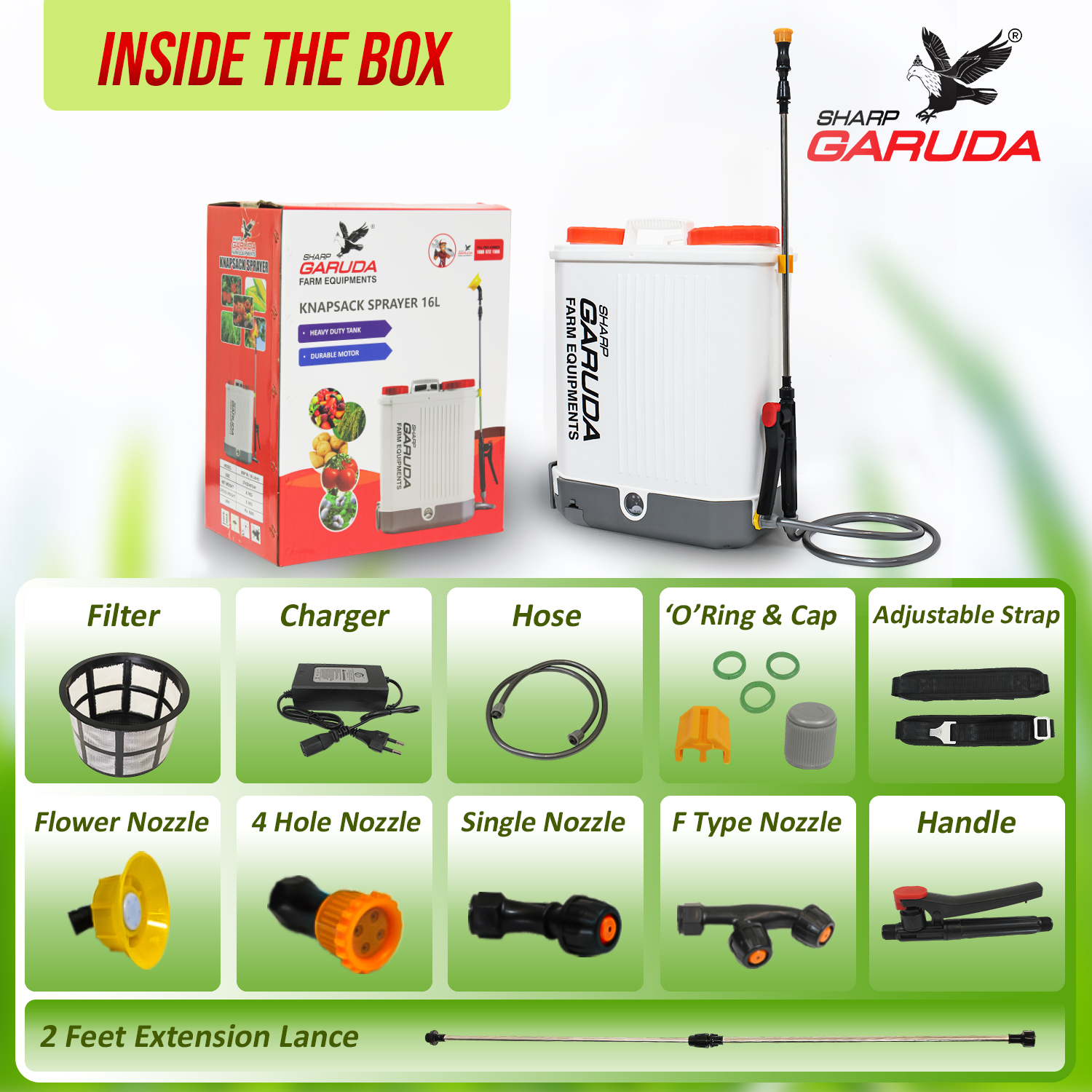 Brand SHARP GARUDA Tank Volume 16 Litres Colour White Recommended Uses For Product Agriculture Material Polypropylene (PP) Item Weight 5.3 Kilograms Product Dimensions 22W x 37H Centimeters Style Backpack Power Source Battery Powered Included Components Delivery Pipe, Clutch, User Manual, Lance, Tank Filter, Washer and Regulator Cap, Charger, 3Nozzles Set Model Name Sharp Garuda Electrical Battery Sprayer Pump 16L Maximum Pressure 0.45 Kilopascal Hose Length 180 Centimetres