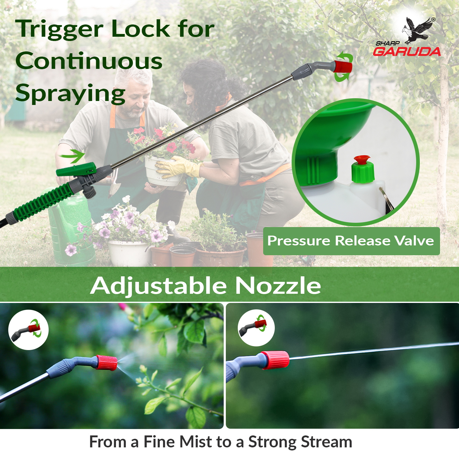 8L Hand Pump Sprayer is a heavy-duty, high-capacity manual sprayer designed for gardening, agriculture, and home cleaning applications. Built from durable PPE material, this chemical-resistant sprayer is leak-proof and long-lasting. It features an adjustable spray pattern nozzle, allowing you to switch between fine mist sprayer, high-pressure sprayer, and continuous spray sprayer modes. The safety valve ensures controlled pressure release, while the trigger lock mechanism provides effortless and continuous spraying. Its adjustable shoulder strap allows for comfortable carrying, making it ideal for large lawns, home gardens, and agricultural fields.
